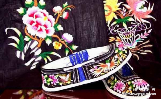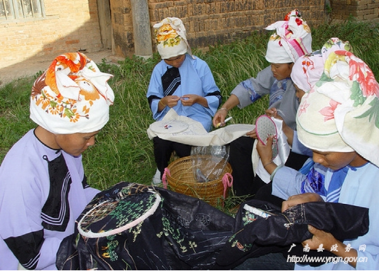 廣南刺繡歷史悠久,遍及壯鄉(xiāng)苗嶺,瑤山彝寨,街頭巷尾,處處都是刺繡的天地。壯族青年婦女的頭飾、圍腰心、圍腰頭、高綁布鞋要繡上圖案裝飾,兒童戴的貓頭帽、花風(fēng)帽、燕尾帽、月牙帽繡有花邊絲綢,帽前鑲有十八羅漢銀器像,帽的左右兩邊掛有兩串銀器以示吉祥,壯族婦女的外衣繡有三角形、四方形花紋圖案,廣南壯族人民使用的生活用品,如被套、枕巾、桌布、窗簾、手帕以及婦女背小孩的背帶、兒童披風(fēng)和靈芝鞋等都要繡上花鳥小草點(diǎn)綴,體現(xiàn)出美的情致。