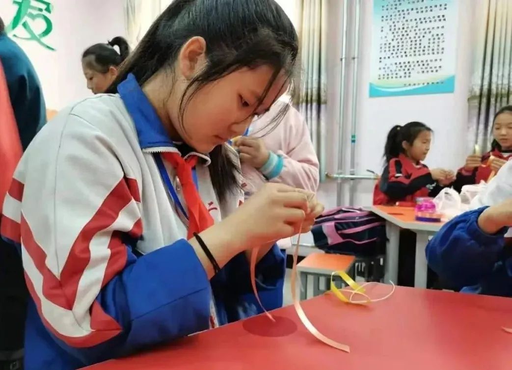 葛玉英說:”芨芨草手工編織品主要有簍、筐、盒、盤、茶墊、時尚包等生活用品,色彩以白、藍為主,圖案以白云紋、曲字紋為主,以針繡法結合草編中的平編、絞編、編花、纏邊、擰編等技法進行編織。在實際教學中,為了方便,我用彩帶代替芨芨草,讓芨芨草編織技藝在孩子們的濃厚興趣中得到傳承,既提高了學生的動手能力,也提升了學生的審美思維和審美能力,同時增強了學生對本土文化的自豪感和自信力?!?/p>