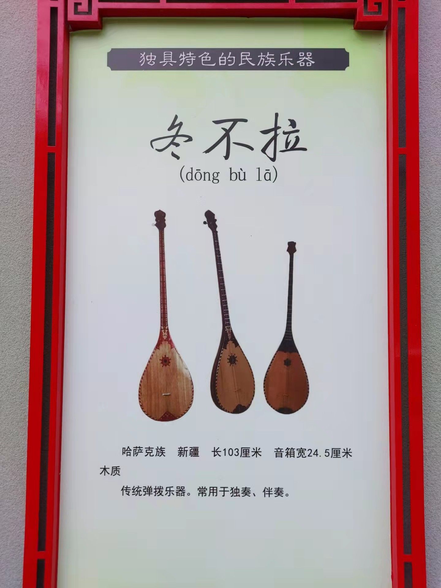 哈薩克族,新疆,長103厘米,音箱寬24.5厘米,木質。