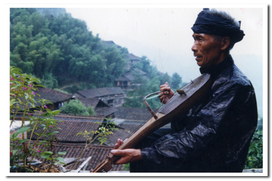 果哈是苗族唯一的古老的民間弓弦樂器,因其形似瓢,故苗語稱之為果哈(意即瓢琴),是唱古歌時不可缺少的伴奏樂器,一般以歌師自拉自唱為主。制作工藝比較粗糙,先選一段長60厘米、直徑為15厘米左右的鴨腳木或泡桐木制成琴身,在其二分之一的一端剜成瓢狀,封住薄板作共鳴箱。另一端修成琴柄,在琴柄頂端鉆孔安琴鈕,用棕繩、牛筋作琴弦,用竹片和綜絲制成弓。琴置兩弦,演奏時以人的唾液代替松香,演奏者時而將弓毛放入口中,讓弓毛增加溫度,增強與琴弦的磨擦,使之發(fā)音。果哈音量微弱,發(fā)音低沉,但音色獨特,與苗歌語調相當協(xié)調,較適合表現安靜、深沉情緒,故常為苗族敘事古歌伴奏。
