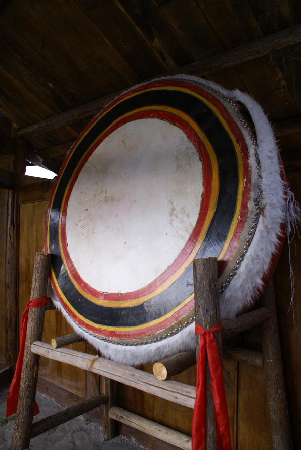 羌族羊皮鼓是打擊樂器,又名“羌鈴鼓”,羌語稱“切歐?!薄扒袩釀e日木”。有兩種形狀,一種是圓形鼓面的鈴鼓,直徑大約30—40厘米。鼓邊寬約15厘米,鼓柄置于正中,抓柄的長度與鼓面的直徑相同,左手從背面握柄。另一種是扇子形狀的鈴鼓,鼓框和鼓柄為鐵制,抓柄端有一裝飾環(huán)圈,圈內(nèi)串以數(shù)個(gè)銅錢。兩種形制鼓面均蒙羊皮,各鼓音高低不一,鼓錘為竹制,敲擊的一端略微呈弓形。羊皮鼓的打法和鼓點(diǎn)的節(jié)奏變化豐富。目前,搜集到的有硬三鞭、軟三鞭、野雞撲、偷點(diǎn)子、牛擦癢等十多種。這些鼓點(diǎn)穿插在每個(gè)唱段與舞蹈銜接變化中,使表演者在統(tǒng)一的步伐、統(tǒng)一的動(dòng)作中,調(diào)節(jié)了節(jié)奏氣氛。由于表演具有即興式特點(diǎn),表演者的技術(shù)嫻熟程度和思想情緒變化將直接影響技巧的發(fā)揮。羊皮鼓突出鼓的表演,氣氛熱烈歡快,動(dòng)作粗獷質(zhì)樸,如“禳星辰”動(dòng)作,就是在鼓點(diǎn)、唱腔、動(dòng)作的有機(jī)結(jié)合中,表現(xiàn)出凜冽的氣勢(shì)。羊皮鼓在表演中,不僅給舞蹈提供了節(jié)奏,豐富了氣氛,而且鼓點(diǎn)的擊打更形成和衍化出許多獨(dú)特的舞蹈語匯。
