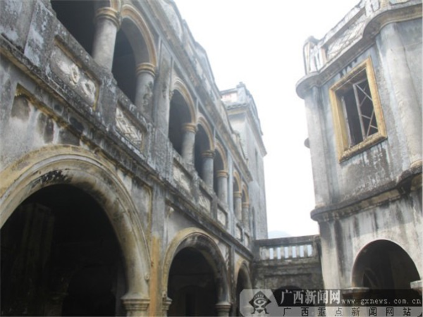 如果說尚德堂是中西混血兒的話,他的兄弟“松柏莊”就是純正的“英國帥哥”?!八砂厍f”具有英國新式古典建筑風(fēng)格,共分為兩層,北面設(shè)有陽臺(tái)。陽臺(tái)及門窗上部均是圓弧形,用帶有高級(jí)的石膏線勾邊。陽臺(tái)由數(shù)十條羅馬柱支撐,檐口用西洋線腳裝飾,具有英國新式古典建筑風(fēng)格。建筑墻體為白色,與墻上“松柏莊”三個(gè)黑色大字相映,十分顯眼,盡顯歐式建筑色彩的視覺沖擊效果。老宅有些殘舊,但墻上的雕畫仍然凹凸有致,圖案清晰可見,這無一不表露這家主人曾經(jīng)的輝煌。