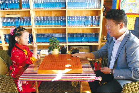 西藏自治區(qū)藏棋協(xié)會(huì)秘書(shū)長(zhǎng)阿旺邊巴正在與孩子下棋。