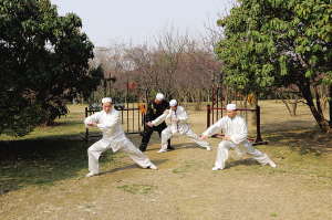 顏勇(中,穿黑衣者)指導回族青年習練晰揚掌