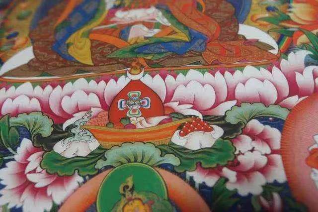 900多年前流傳于衛(wèi)藏地區(qū)(現(xiàn)山南)的齊烏崗派唐卡,由雅堆·齊烏崗巴創(chuàng)立,與嘎瑪嘎赤畫派、勉塘畫派、欽孜畫派、埃赤畫派并稱“唐卡五大畫派”。齊烏崗派特點為人物體形飽滿、生動細(xì)膩,色彩以棗紅、橘紅暖色系為主;中央的主尊突出,背景多用卷草紋作為裝飾。特別是,齊烏崗派唐卡的佛像肩膀旁都有象征翅膀的“三角”,源于創(chuàng)始人齊烏崗巴行動靈敏,亦被稱作“齊烏派”。