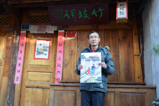 張旭東的童年,是在祖父母的耳提面命中度過的,他跟隨老人習書繪畫,學禮明俗。到了弱冠之年,他逐一拜訪古鎮(zhèn)中尚在的民國時期出生的老輩文人,向他們請教劍川白族傳統(tǒng)民俗,并做了系統(tǒng)梳理,這也為他后來繪制年畫、撰寫春聯(lián)打下扎實的理論基礎(chǔ)。