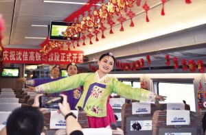 沈佳高鐵長白山至敦化段開通運營,將促進沿線旅游業(yè)和冰雪經(jīng)濟快速發(fā)展,進一步加強民族團結(jié),助力長吉圖開發(fā)開放、深度融入 “一帶一路”。圖為列車工作人員在車內(nèi)表演朝鮮族歌舞。 新華社發(fā)