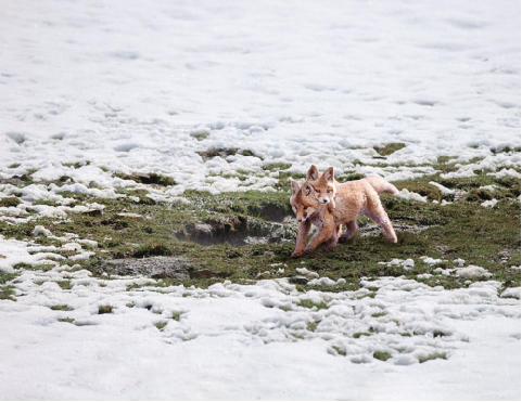時(shí)至中午,幾個(gè)小家伙變得急躁起來。它們向著爸爸媽媽捕食回來的方向,一溜兒排開,蹲在洞門前,眼神中充滿期盼……這時(shí),空中的紅嘴鴨俯沖下來,嚇得小赤狐們趕緊竄進(jìn)洞中。