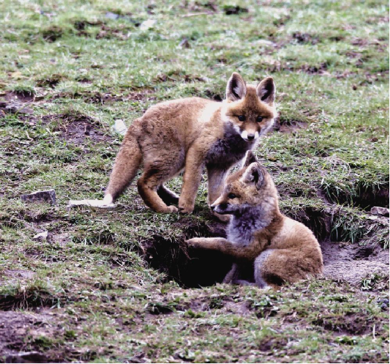 藍(lán)天白云,微風(fēng)輕漾;草地碧綠,鳥語花香。大自然的美景圖正在小赤狐的家園四周徐徐展開。在膽大的小赤狐的叫喚聲里,躲在洞內(nèi)的另外兩只小赤狐也壯著膽子探出頭來。不一會兒,它們習(xí)慣了周圍的環(huán)境,三只小赤狐在離洞口5米遠(yuǎn)的范圍內(nèi)嬉戲玩耍著。它們時(shí)而跳躍,時(shí)而奔跑,展現(xiàn)出本能的捕獵動作。稍大一點(diǎn)的小赤狐騎在小一點(diǎn)赤狐的背上嬉戲玩耍,小赤狐也不示弱,奮力反擊,猶如兒童打鬧,其樂無窮。那烏黑溜圓的眼睛彎了又彎,毛茸茸的尾巴高高地翹起,身體嬌小,惹人喜愛,讓人看了會產(chǎn)生想上去抱一抱、摸一摸小赤狐身軀的念頭。