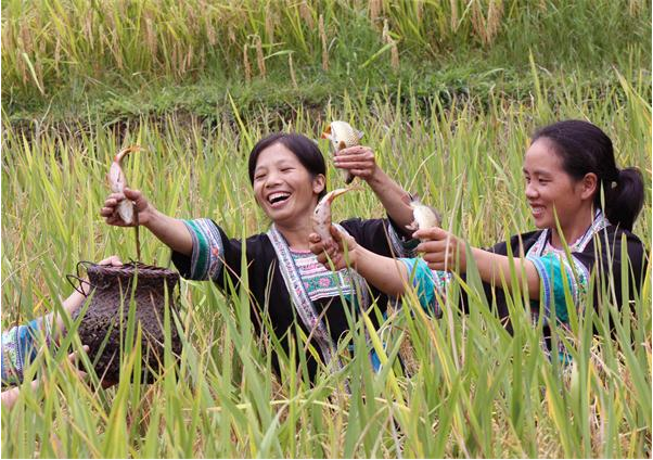 吃的時(shí)候,大家圍攏到火堆,一手拿著糯米飯,一手拿著燒鯉,撕開成片,邊蘸鹽水邊吃。男人舉杯對(duì)飲,到處是“呀-嗚-呀-嗚-”的喜慶豐收喊聲和悅耳動(dòng)聽的苗歌聲,好一幅農(nóng)家樂圖畫。