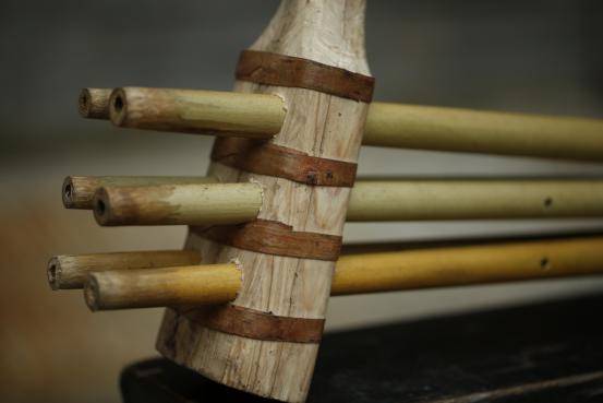 共鳴管:是套在笙管上端的一截竹管,可使音量明顯增大,多使用毛竹制作,依音高不同而異,以c、c1、c2三音為例,管長(zhǎng)分別為60厘米、30厘米、15厘米,余者類(lèi)推。以上所述為黔東南地區(qū)的苗族蘆笙;在黔中、黔南和黔西北,則流行著另一種形制的蘆笙,笙管用白竹或筍殼竹制作,下端管口不堵塞。上端用兩道竹篾箍緊,笙斗制作時(shí)中間不剖開(kāi),而是從粗端挖起,直通細(xì)端吹口部位,然后用圓木塞把粗端開(kāi)口堵嚴(yán),再用數(shù)道化篙皮箍住。