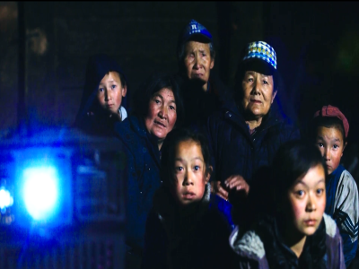 認真看電影的村民
